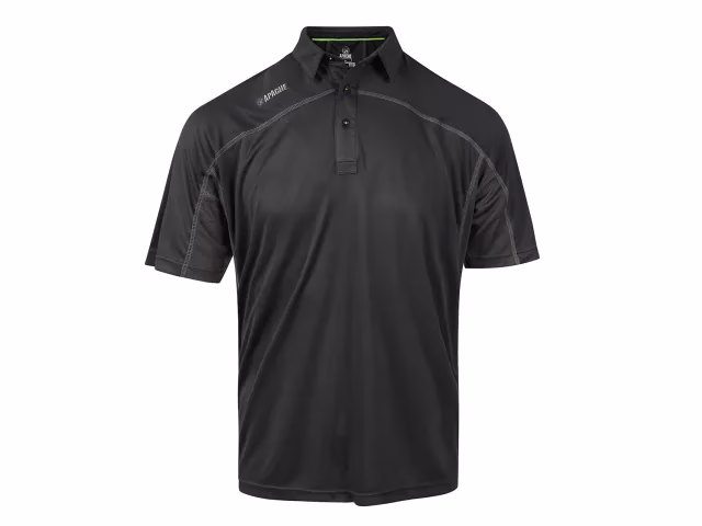 Apache Langley Black Performance Polo Shirt with a self fabric collar and three button placket. Made from polyester interlock fabric. This fabic has the durability of polyester but it feels like cotton, providing all day comfort. It also features embroidered Apache branding to the right chest and neck.