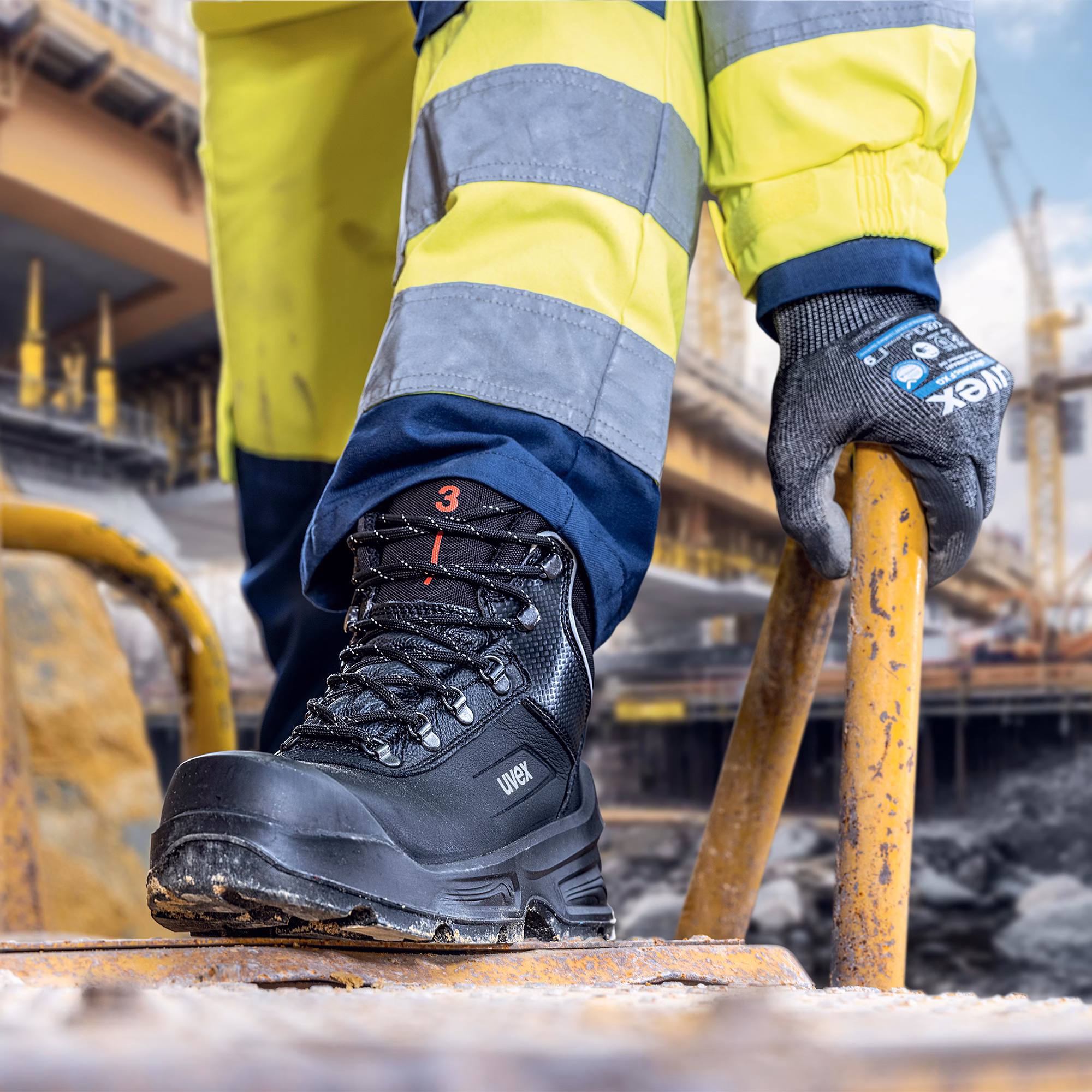 Engineered for demanding industrial settings, the uvex 3 quatro safety boot delivers robust protection, stability, and comfort. The boot features a dual-density polyurethane sole enhanced with uvex i-PUREnrj planet technology, which maximises shock absorption and energy return to help reduce fatigue during extended wear. Incorporating 10% recycled PU granulate, it supports eco-conscious manufacturing without sacrificing durability. The ergonomically shaped bionom x outsole ensures excellent grip and comfort, offering resistance to slips, oil, fuel, and brief heat exposure up to 120°C. The upper is made from hydrophobic leather for water resistance, while the breathable mesh lining helps maintain a balanced internal climate. A foamed PU heel basket adds extra support and keeps feet elevated above wet or muddy surfaces. Reflective accents enhance visibility in dim environments.